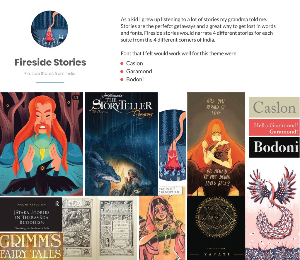 I decided to go with the theme Fireside stories since I have always wanted to illustrate stories and the theme would help me explore a serif font. Serif fonts are special since that is where the web fonts originally came from. Each Suite will be a folktale from a different part of India. North, South, East, and West. The stories will be simple clear and accompanied by illustrations while exploring typography in depth.